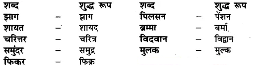 प्रश्न 1 – निम्नलिखित शब्दों के शुद्ध लिखें झाग, पिलसन, शायत, ब्रम्मा, चरित्तर, विदवान, समुंदर, मुलक, फिकर